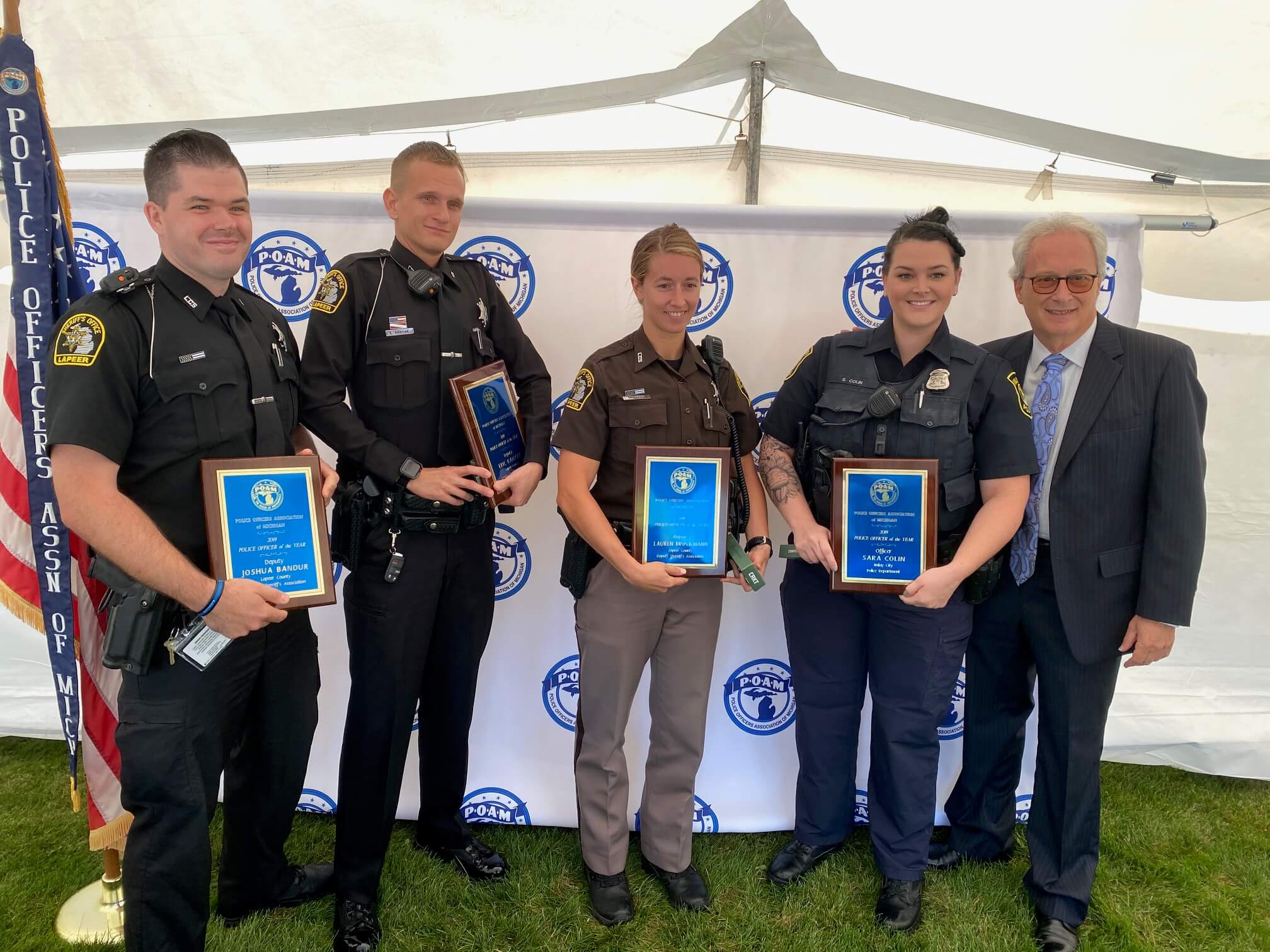 It is here where Lapeer County Sheriff’s Sgt. Brady and Deputies Joshua Bandur, Lauren Brockmann, Eric Kanyak, and Imlay City Police Officer Sara Colin went above and beyond the call of duty and sacrificed personal safety as they assisted in the removal of the near lifeless residents, including small children from the flame-engulfed home. As Brady, Bandur, Brockmann, Kanyak, and Colin were trained, they attempted to render medical aid and CPR to some of the victims. Through the chaos and trauma, Brady, Bandur, Brockmann, Kanyak, and Colin maintained a professional demeanor that demonstrated their bravery in dealing with the stress of the enormously harrowing experience.