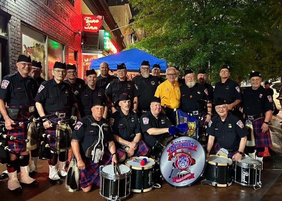 The Metro Detroit Police-Fire Pipe and Drum Corps leads a march that has become a defining moment of the evening.