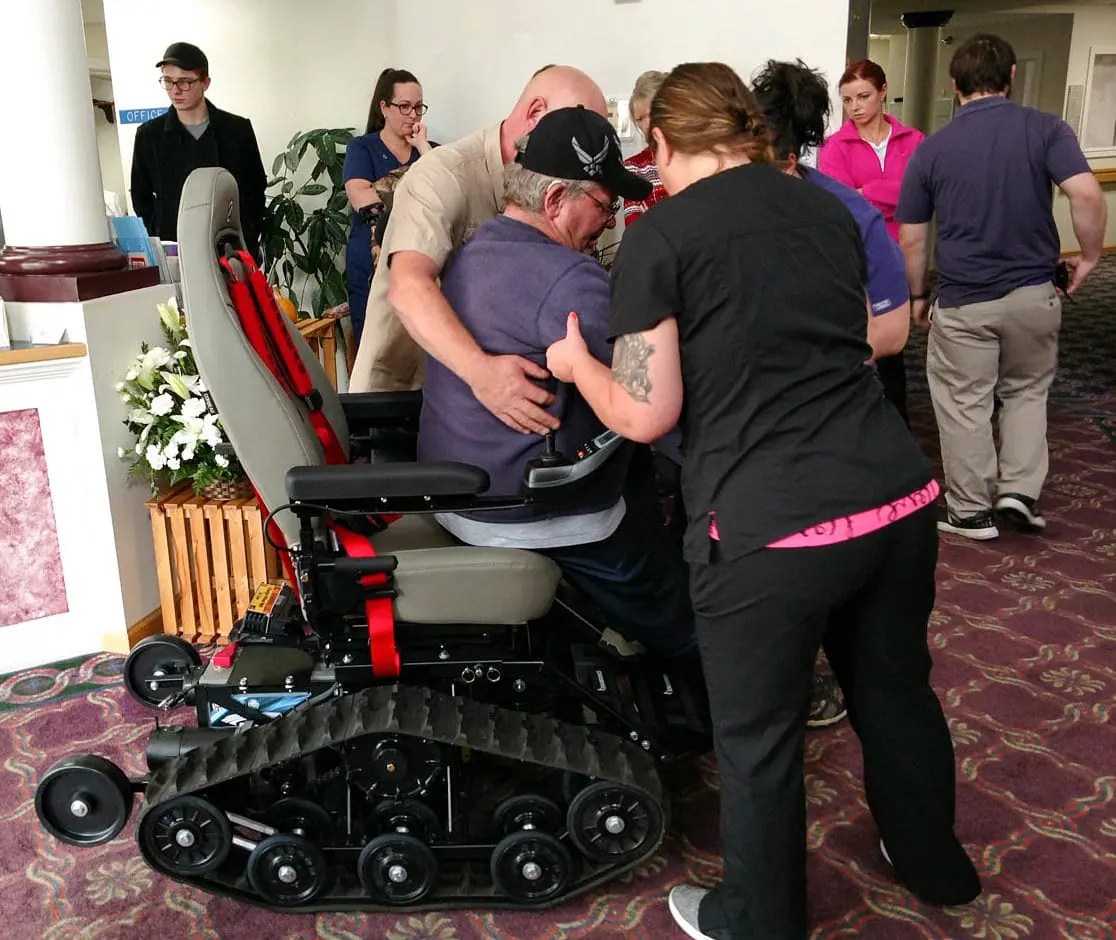 POAM has also donated an additional TracFab chair to Whispering Pines Senior Living, the facility in which Dan lives. Whispering Pines currently has nine residents and one staff member who have fought for this country. This chair will be able to be used by all residents confined to wheelchairs.